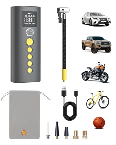 Shell シェル 電動空気入れ 6000mAh 大容量バッテリー 最大圧力150PSI 自転車 空気入れ バイク 車 用 エアコンプレッサー 小型 Type-C 充電式 コードレス 自動停止 低騒音 仏/英/米式バルブ対応 SOS/LED懐中ライト付き エアポンプ モバイルコンプレッサー AC014