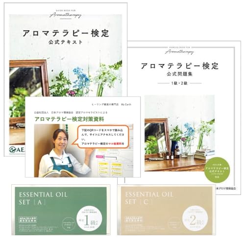 講座付き香りも学べるアロマテラピー検定一発合格セット (公式テキスト+問題集+1級2級対応精油セット+マル秘対策資料+Zoom講座+メール講座) アロマ検定1級受験にオススメのAEAJ認定校による徹底サポート